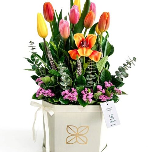 Box de 08 rosas, delicado follaje y toques de flores de la estación. Incluye pin y dedicatoria.